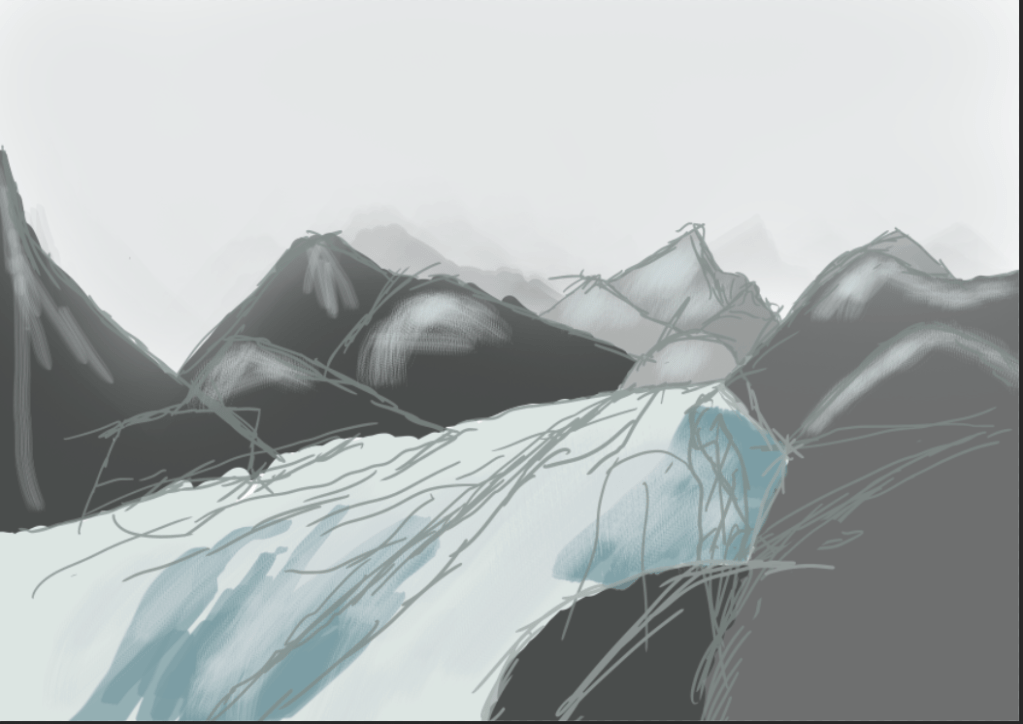 In my next rough sketch I have designed another environmental piece this time using a different texture and layout of the landscape. As I am still practicing with creating environment art I have decided not to include any western assets onto this sketch as I would first like to get a feel on how to create a scenic environment using a variety of colours and brushes whilst manipulating the opacity level on the brushes and layers.