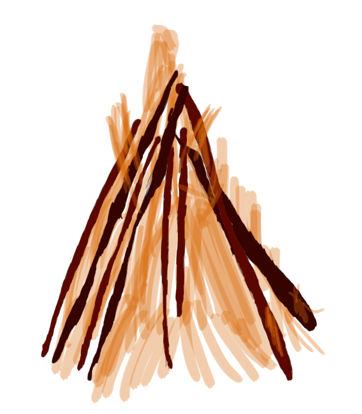 For this next sketch I have done a second design of my fire pit though this time I have gotten rid of the base made of rocks and just made the wood support itself through their stance on the ground. I have produced this second design of my camp/bonfire as I am trying to experiment with multiple styles of each asset so I can decide which design I feel would fit my diorama best and from this image I can see that it would fit just as well as my previous campfire. Although I like this design I did struggle with multiple aspects of it which included structuring the fire wood and implementing the texture as even though I had the assistance of a reference image for this art piece It was still difficult to draw the firewood due to the irregular shape of it and trying to make them all scaled different from one another. For the texture I was unable to neatly keep the colour inside the lines but did my best in keeping the texture strictly located to the firewood as this was the only area that would have the dark red scheme. Whilst I struggled with creating the firewood the creation of the raging fire in the center was relatively simple as all I did was create a new layer and lower the opacity before painting the fire onto the scene.