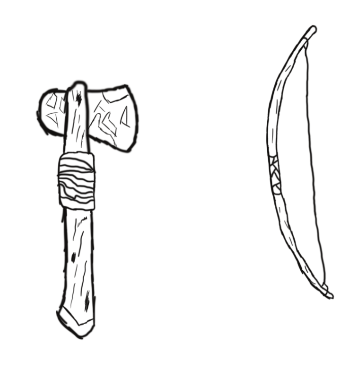 In my diorama there will be a series of tools and weapons scattered around the campsite including hatchets and longbows which are common place in the western genre in use by Native American settlers. These two weapons will be among those included in my diorama alongside a few others of which I have not yet designed. These sketches have helped me in understanding how one of these tools should be scaled along with how to best implement detail whilst being able to accurately follow a reference.
