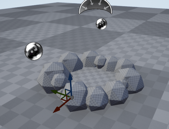 In this image I have started blocking out a firepit using the assets available in the Unreal engine. The objects I have used include a cube and a series of spheres which I have all scaled down and laid out appropriately. For the spheres I have scaled them all into different sizes so that they can appear more like stones which are all irregular in size and shape making no stone related at all and so I have used the tools available on Unreal to manipulate my spheres into making each of them as independent as possible.