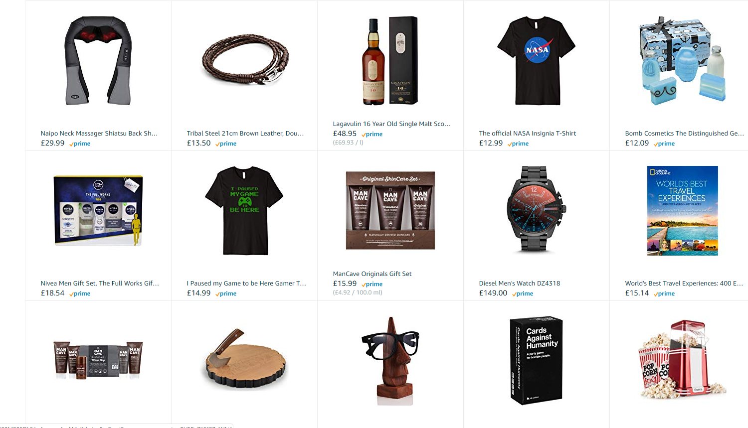 From this image we can see what products men like to buy and from the inclusion of products such as cards against humanity and a travel experience book we can tell that my audience would enjoy a game that includes dark and dry humour whilst also having an interesting setting that provides a good depiction of the real location. The presence of popcorn also hints towards them being inclined to enjoying a long cinematic experience that focuses heavily on a written storyline. The information here will help me with adding humour into my diorama whilst making it appeal aesthetically to the viewer.